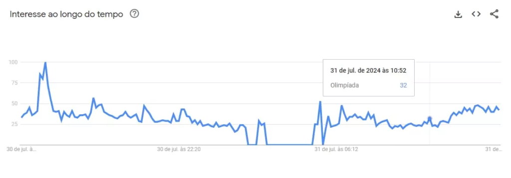 Esse processo é aplicado a cada ponto no gráfico do Trends. Por exemplo, durante as Olimpíadas de 2024, o ponto mais alto do gráfico recebeu o valor “100” em 30 de julho de 2024, e todos os outros dados foram ajustados proporcionalmente a esse valor.