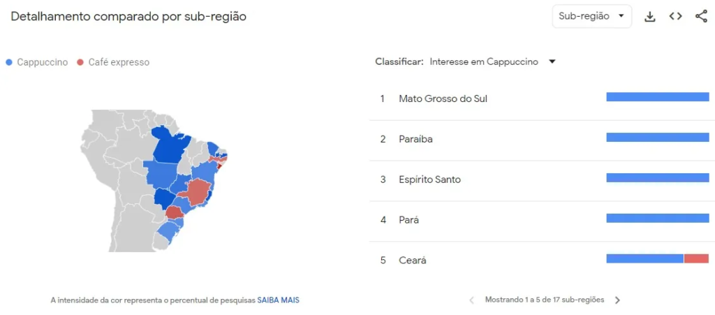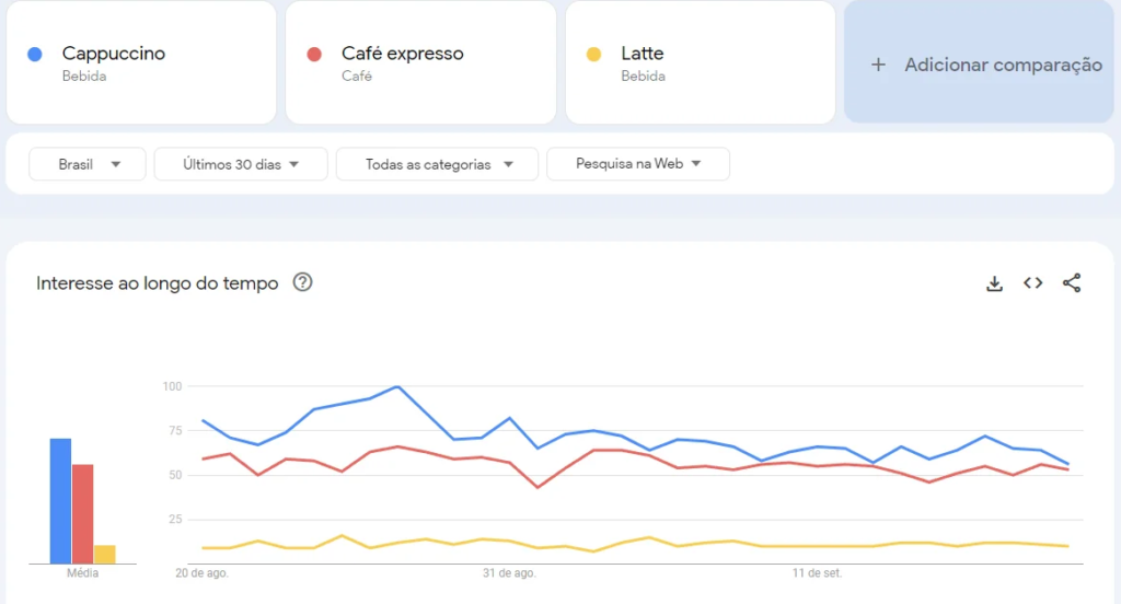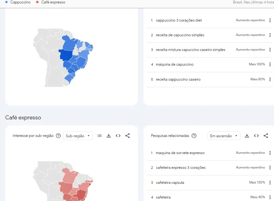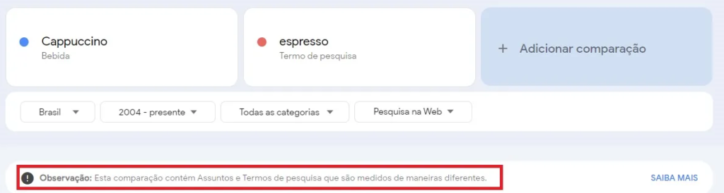 Em seguida, você pode clicar em “comparar” para adicionar outros termos ou tópicos relacionados, como “espresso”. O Google Trends permite incluir até cinco expressões simultaneamente, possibilitando uma análise detalhada das diferenças de popularidade entre palavras-chave ao longo do tempo e em diferentes regiões.