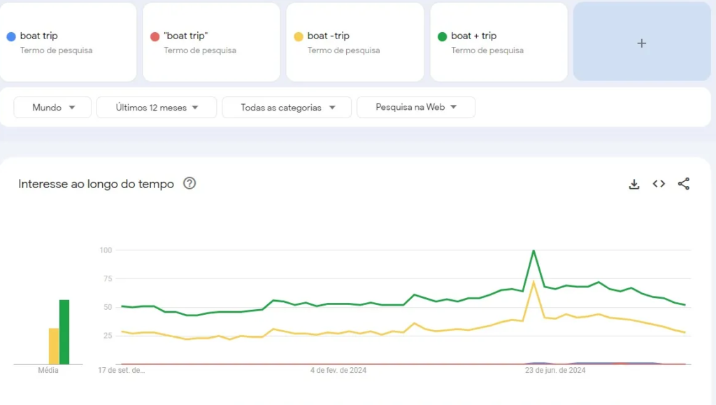 É importante destacar que os operadores – e + são muito amplos e podem gerar grandes volumes de resultados, o que pode distorcer os gráficos e ocultar pesquisas específicas, como “boat trip” e “boat trip” exato. Por isso, seu uso deve ser estratégico para evitar interpretações equivocadas e garantir análises precisas no contexto de SEO e marketing de conteúdo.