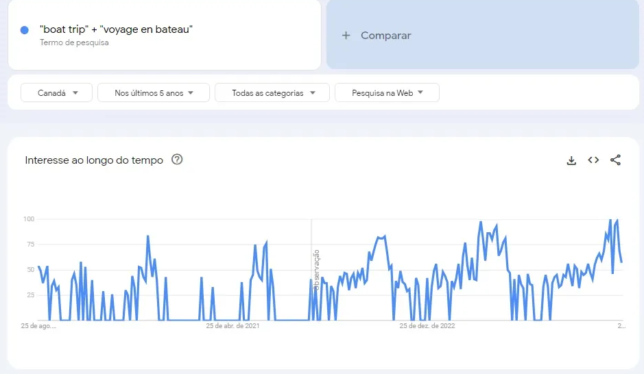 Por exemplo, é possível pesquisar “boat trip” + “voyage en bateau” para avaliar o interesse em viagens de barco tanto em inglês quanto em francês.