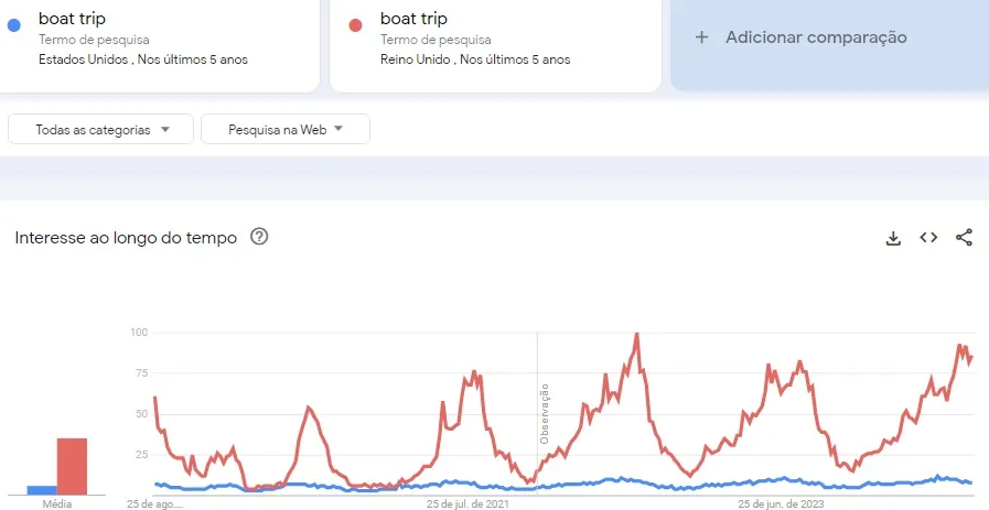 Por exemplo, imagine uma empresa que oferece serviços de viagens de barco no Reino Unido e pretende expandir para os Estados Unidos. Ao analisar o gráfico, percebe-se que o interesse é significativamente maior no Reino Unido. Dessa forma, estratégias de SEO e campanhas no Google Ads talvez não sejam prioritárias para promover o negócio nos EUA, evitando desperdício de recursos e permitindo foco em mercados com maior potencial de retorno.