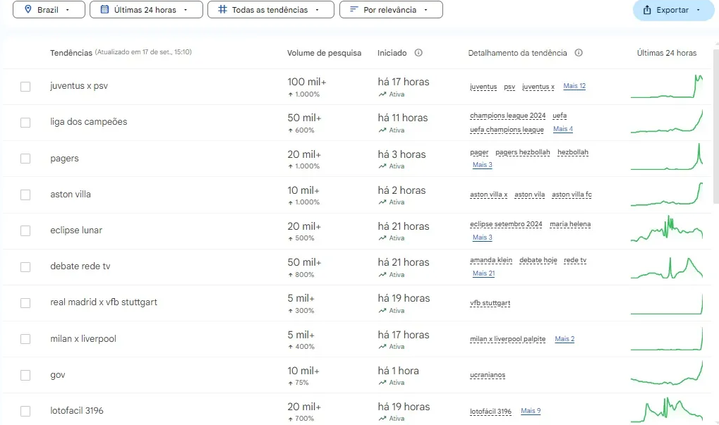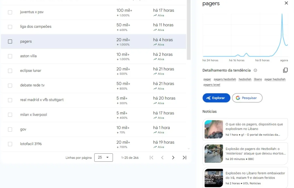 Além disso, é possível clicar em cada termo para obter uma análise mais detalhada. Por exemplo, ao selecionar o termo “pagers”, percebe-se que a tendência surgiu devido a acontecimentos específicos, como atentados recentes no Líbano, fornecendo contexto para compreender melhor o interesse do público.